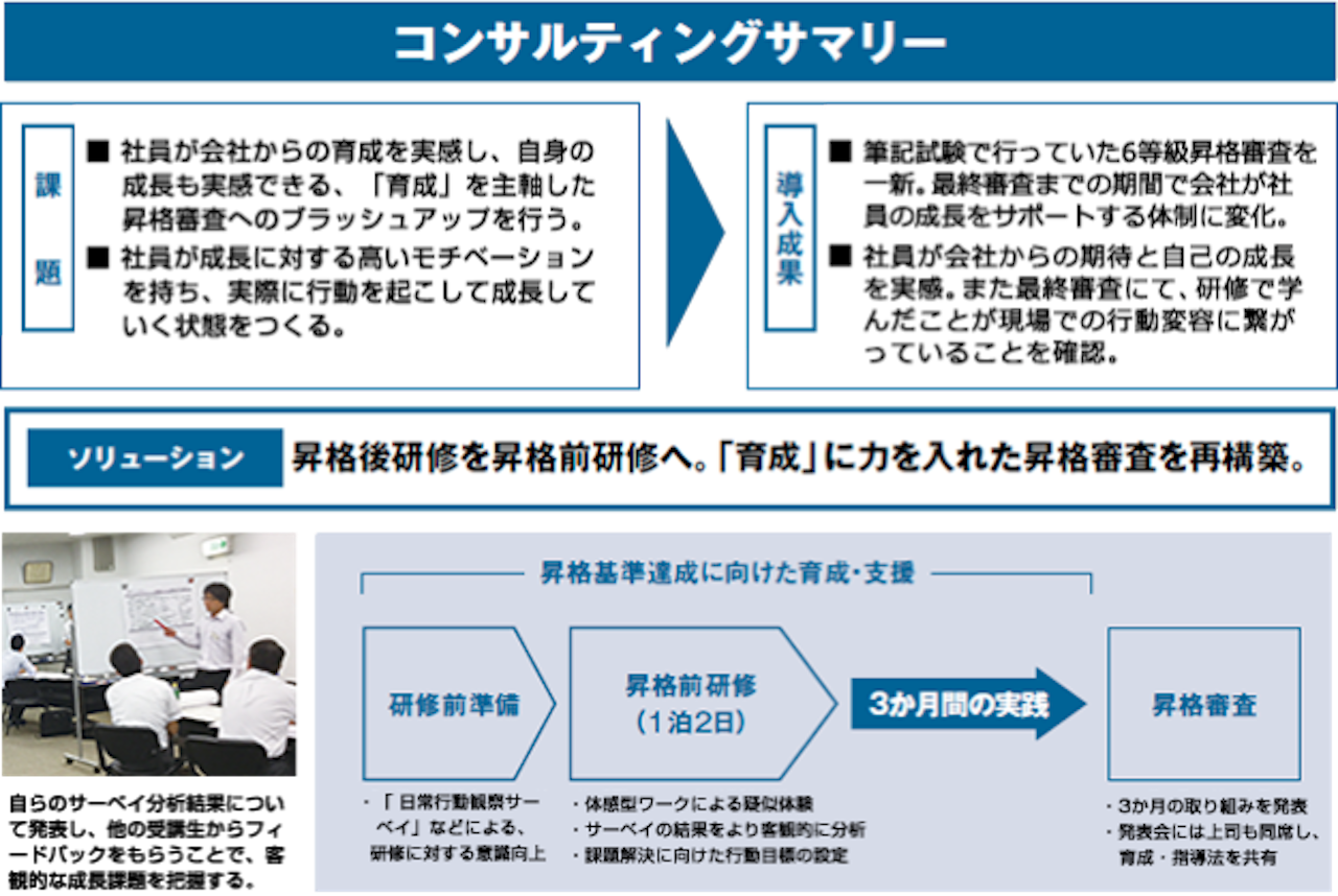 この流れを重視し、「育成を主軸とした昇格審査へブラッシュアップしたい」と思っていた私たちを手助けしてくれたのが、アチーブメント社の研修コンサルティングだったのです。