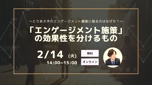 本セミナーでは、エンゲージメントに関する多様な取り組みの“いま”を探ることで、エンゲージメントの必要性が増している現代においてエンゲージメント向上を妨げる構造的な問題を明らかにしていきます。2023年1月弊社が独自に行ったエンゲージメントに関する最新の調査結果も用いながら、“とりあえずのエンゲージメント調査”に陥りがちな落とし穴をご紹介します。