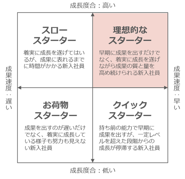 社会人1年目期間の「成果速度」が早く、「成長度合」が高い “理想的なスターター”になるためのマインドセットを育みます。