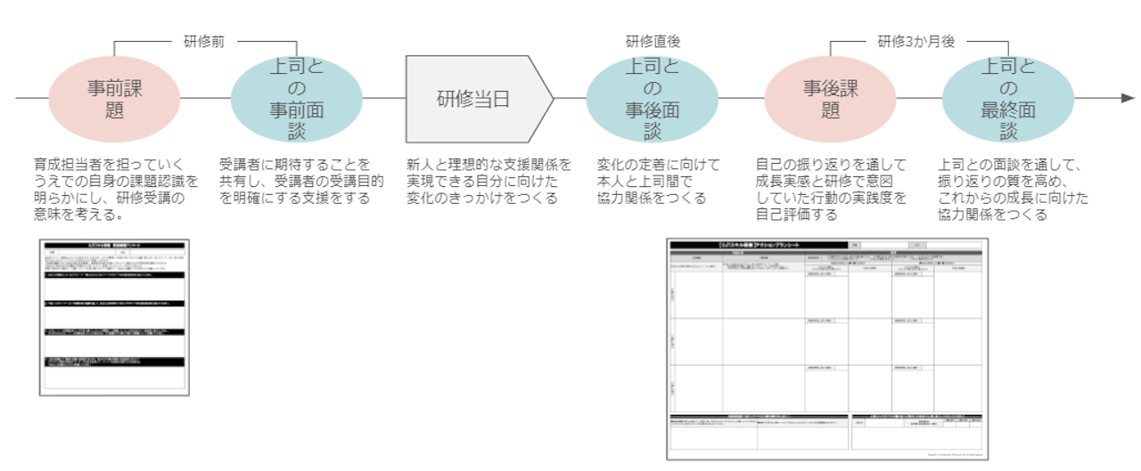 「上司の巻き込み」と「自己の振り返り」を組み込むことで、研修後の変化の定着を支援します。
