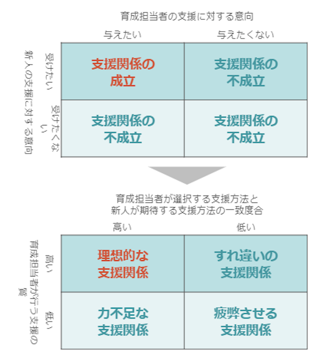 弊社の答えは、OJTの質は、新人を取り巻く「支援関係」が生み出しているということです。その中の最も重要な支援関係の一つが、新入社員と育成担当者の二者間によるものです。