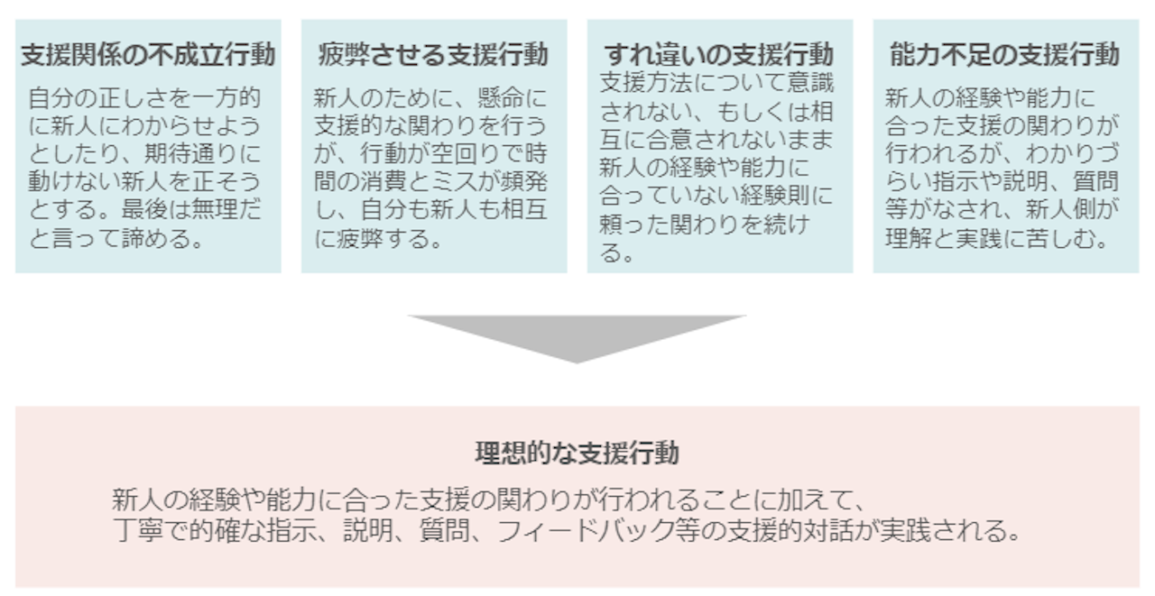新入社員との支援関係が成立する基盤を形成し、 「理想的な支援関係」へと発展させるOJTスキルの習得を促進します