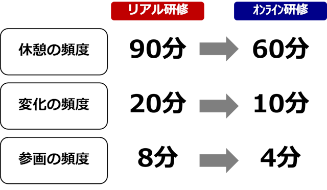 - ひとつのモジュールは60分以内に収め、60分に一度の頻度で休憩をとる。