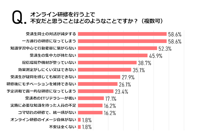 実際、アチーブメントHRソリューションズが独自に調査を行った「オンライン研修を行う上で不安だと思うことはどのようなことですか?」というアンケートに対する回答は図の通りとなっています。