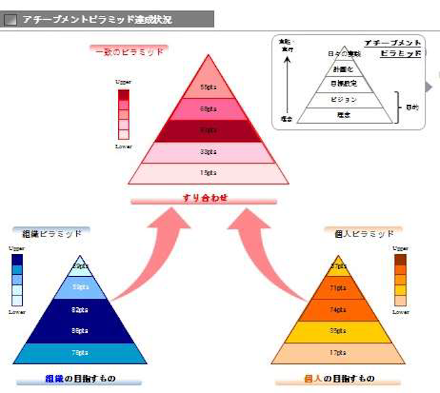 理念浸透サーベイは、組織と個人のそれぞれの価値観、ビジョン、目標設定、計画化、日々の実践の全てのレベルを定量データとして計測します。さらに、各レベルでの両者の一致まで含む15項目を可視化します。 重点的に対策を講じるべき点は個人の価値観なのか?組織のオペレーション管理なのか?それとも、組織と個人のビジョンを擦り合わせることなのか?理念浸透サーベイでは、「組織」「個人」「マッチング」の3つのピラミッドのどこに課題があるのかを可視化します。