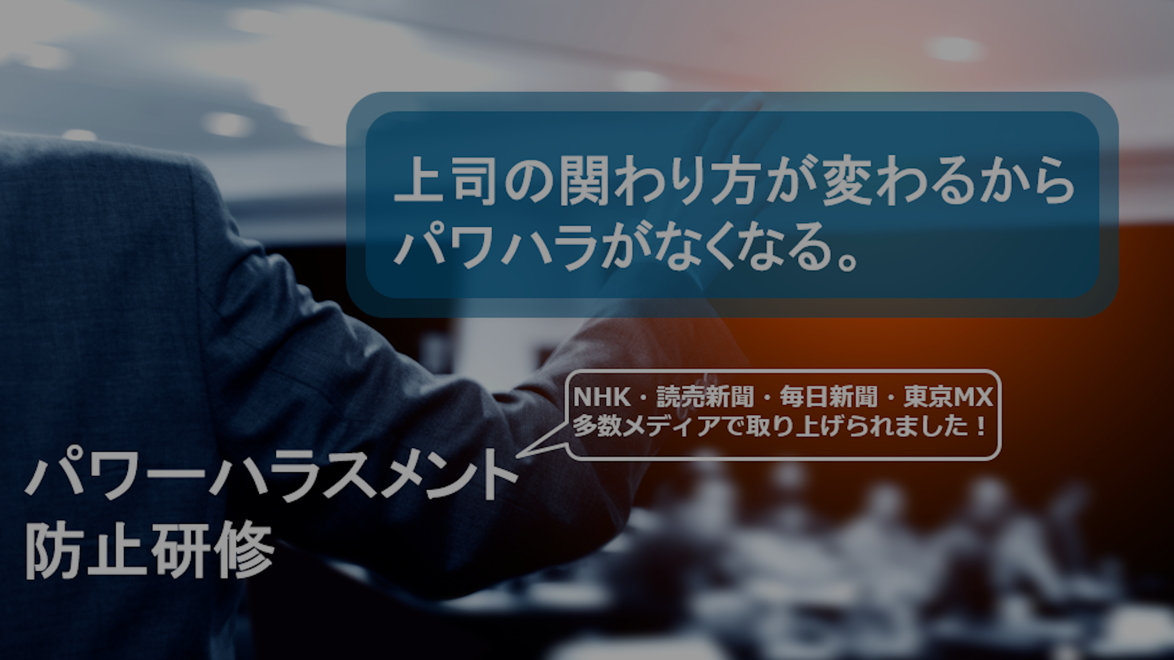 弊社のパワーハラスメント防止研修では、パワハラとされる行為を明確にし、やってはいけない行為を学習するだけでは終わりません。「どんなマネジメント・社員の育成が正解か」という疑問に答え、部下の成長を加速させる具体的なマネジメント方法を学習します。パワーハラスメントを禁止するだけでなく、適切な部下とのコミュニケーションとマネジメントを学ぶことで、より現場に活きる効果的なパワーハラスメント防止を実現します。