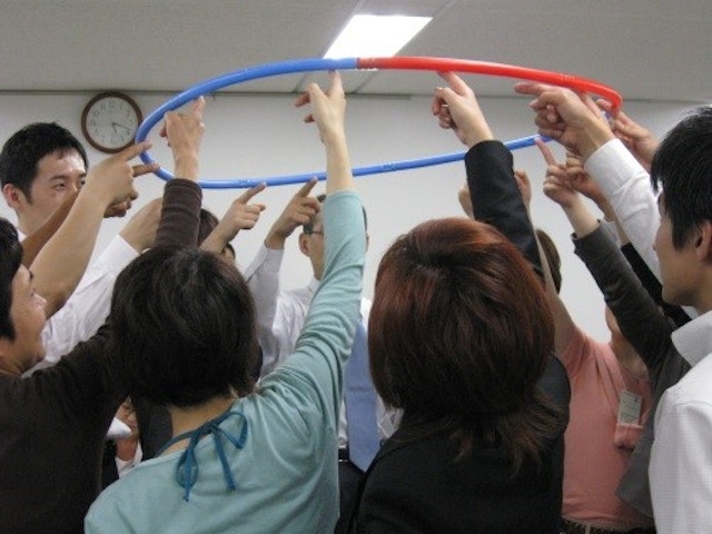 それぞれの指に乗せたフラフープをチームで協力して上から下まで降ろしていくワーク。一見、簡単に見えるが取り組んでみると、チームが本当に一丸となっていないと思うようにいかない。チームワークを改善していくためのポイントは何か、どのように行動すれば目標達成に向かうのかを体験的に学ぶ。
