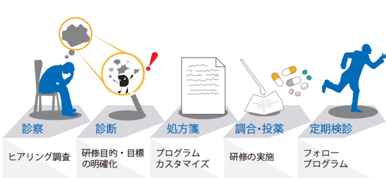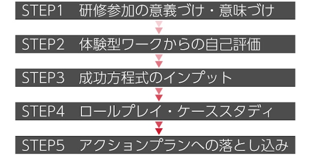 創業以来26年間培ってきた経験と最新の心理学・脳科学に基づき、研修効果が最大化する社員研修の進め方を体系化。社員研修を5段階のステップに分け、参加者一人ひとりの学習を最大化するように講師がリードしていきます。